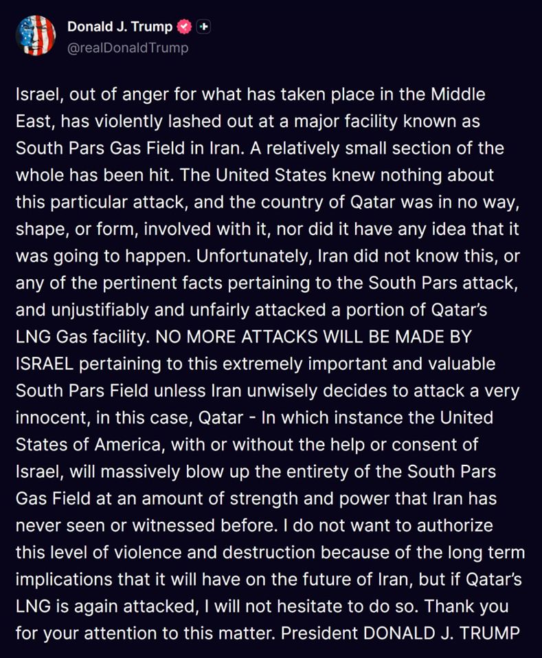 And here we come back full circle to the first days after the start of this disastrous conflict, when Marco Rubio astonished the world and laid bare that Israel had attacked Iran, apparently unprovoked, and that the U.S. felt forced to join in. Araghchi has signaled the same, and Tucker Carlson -who has operated as a dissident magnet wing-man for Trump -was then operationalized in bringing Kent on the show to reinforce this same point. All this comes to a conclusion right as Trump releases his Truth post: "Israel, out of anger for what has taken place in the Middle East, has violently lashed out at a major facility known as South Pars Gas Field in Iran...".
