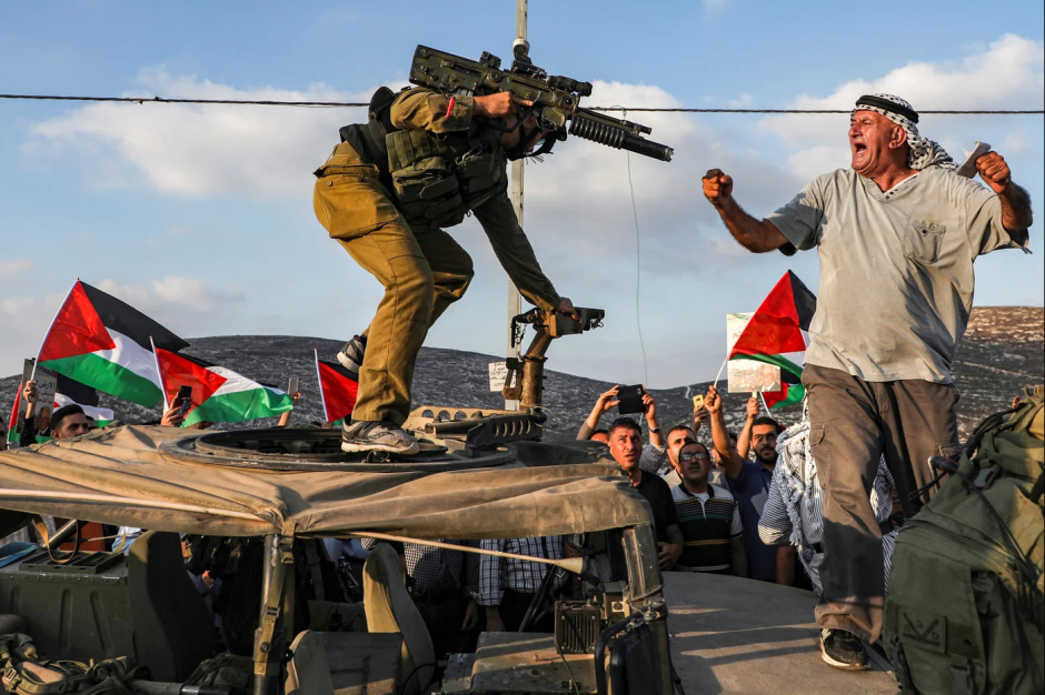 Un manifestant palestinien s'oppose à un soldat israélien près du village palestinien de Naqura, au nord-ouest de Naplouse, en Cisjordanie occupée, le 4 septembre (AFP).