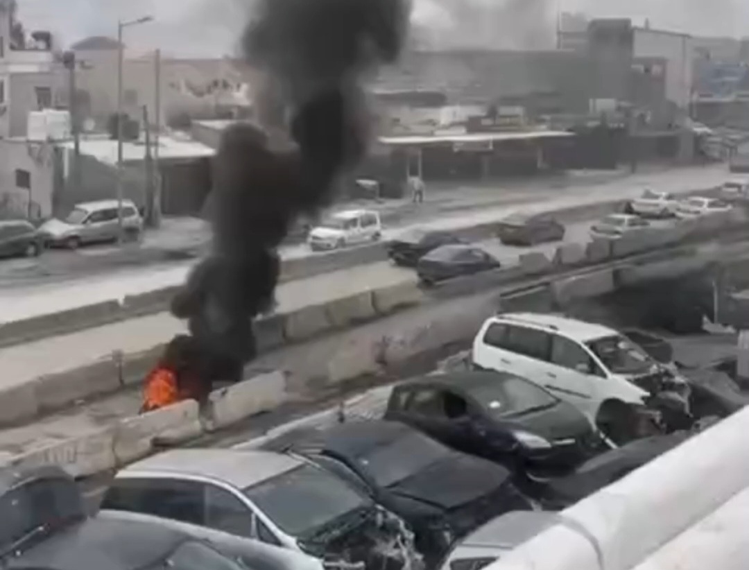 Des manifestants palestiniens brûlent des pneus au checkpoint israélien de Qalandia, au nord de Jérusalem occupée, pour protester contre l'approbation par le Parlement israélien de la peine de mort pour les détenus palestiniens.
