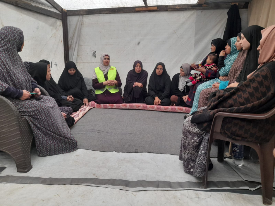 Dans ce cadre a été organisée la séance : Ensemble, nous surmontons les difficulté, le réseau de sécurité, mise en œuvre par l'équipe UJFP dans le camp d'Al-Israa, à l'ouest de Gaza, avec la participation de 25 femmes déplacées. Cette rencontre a ouvert un véritable espace de dialogue sur la manière de transformer cette proximité contrainte en source de force plutôt qu'en facteur de pression supplémentaire.
