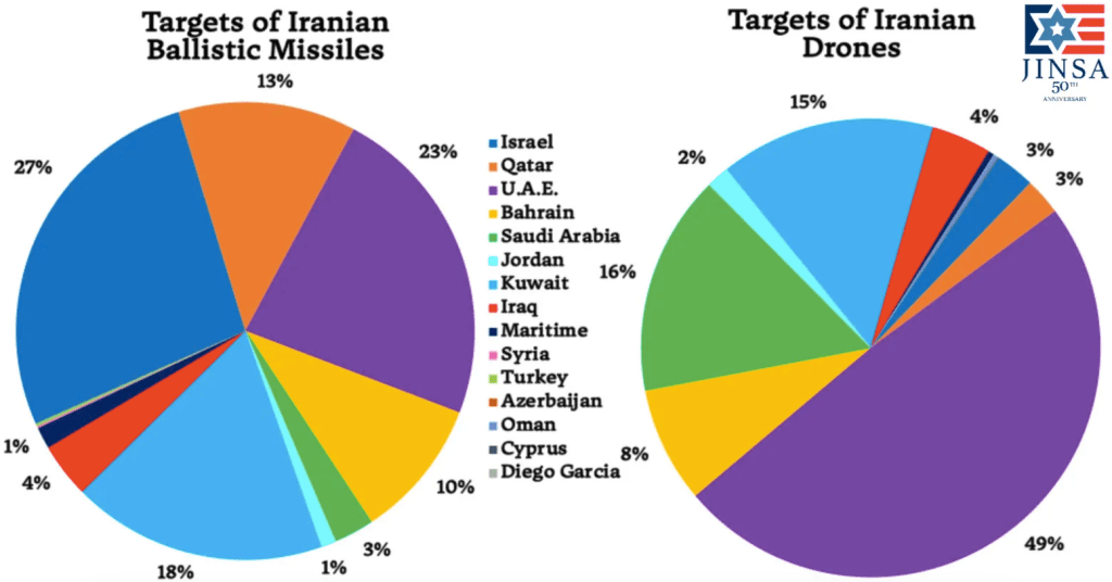 "La plupart des bases, ports et villes du Golfe se situent à proximité des zones de lancement iraniennes, ce qui réduit le temps dont disposent les forces de défense pour détecter, suivre et neutraliser les menaces. Les missiles balistiques iraniens lancés vers le Koweït, Bahreïn, le Qatar ou les Émirats arabes unis peuvent atteindre leurs cibles en trois à dix minutes, soit une fraction du temps déjà très court de 12 à 15 minutes nécessaire aux missiles balistiques pour atteindre Israël".
