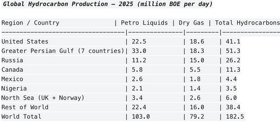 In short, the global hydrocarbon market is highly integrated and with the rise of the LNG sector and growing LNG tanker fleet has become more seamless than ever under the one price rule of markets. In this context, the US production in 2025 of 41.1 million BOEs per day of petro liquids and nat gas was nearly as large as the 51.3 million BOEs per day coming out of the Persian Gulf. ((Saudi Arabia, Iraq, UAE, Iran, Kuwait, Qatar, and Oman).