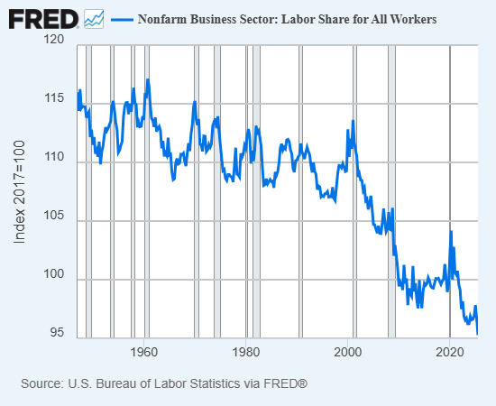 Here we see the percentage of the economy going to labor is in a long-term slide--a slide that AI will accelerate as it replaces the lower tranche of cognitive labor employees.